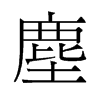 《字彙補》古文塵字。註詳土部十一畫。(塵)〔古文〕??尘《唐韻》直珍切《集韻》《韻會》《正韻》池鄰切,?音?。埃也。《爾雅·釋詁》久也。謂塵垢稽久也。《詩·小雅》無將大車,祗自塵兮。《後漢·班固傳》風伯淸塵。《拾遺記》石虎起樓四十丈,異香爲屑,風起則揚之,名芳塵。《嶺南表異錄》犀角爲簪梳,塵不著髮,名辟塵犀。
