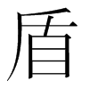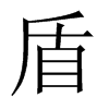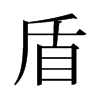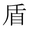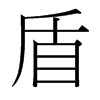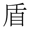 《唐韻》食尹切《集韻》《韻會》豎尹切,?犉上聲。《說文》瞂也,所以扞身蔽目,象形。《釋名》遯也。跪其後,避以隱遯也。《詩·秦風》龍盾之合。《傳》盾,干也。畫龍於盾,合而載之,以蔽車也。《左傳·定八年》虞人以鈹盾夾之。《周禮·夏官》司兵掌五盾。《註》干櫓之屬。《齊語》管子曰:制輕罪,贖以鞼盾一戟。《註》綴革有文,如繪也。《管子·幼官篇》兵尚脅盾。《註》署之于脅,故名。《宋史·兵農志》楊偕獻所製神盾。《元史·世祖紀》馬八國進銅盾。