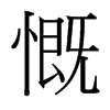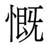《集韻》《韻會》?口漑切,音欬。忼慨,壯士不得志也。从心旣聲。《徐曰》內自高亢憤激也。《後漢·馮良傳》慨然恥在厮役。