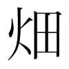 说明:“畑”字有几笔几画,是根据康熙字典及五格姓名学而来,并不一定与新华字典的笔划数相同。“畑”字五行属什么、“畑”字的取名吉凶,则是根据周易万物类象推断,仅供起名参考。