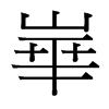 〔古文〕?《廣韻》戸花切《集韻》《韻會》《正韻》胡瓜切,?音華。《說文》西嶽名。在弘農華隂西南。从山,華省聲。《白虎通》西嶽爲崋山者,崋之爲言穫也,言萬物成熟,可以得穫也。《山海經》大崋山,削成而四方,高千仞,廣十里。《註》今山上大下小,峭峻也。通作華。《華山記》山頂有池,生千葉蓮,服之羽化,因曰華山。