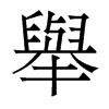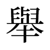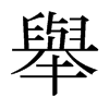 说明:“舉”字有几笔几画,是根据康熙字典及五格姓名学而来,并不一定与新华字典的笔划数相同。“舉”字五行属什么、“舉”字的取名吉凶,则是根据周易万物类象推断,仅供起名参考。