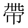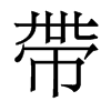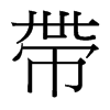 《唐韻》《集韻》《韻會》《正韻》?當蓋切,音㯂。《說文》紳也。男子搫帶,婦人帶絲,象繫佩之形。佩必有巾,故帶从巾。《徐鉉曰》卌,其帶上連屬固結處。《釋名》帶,蔕也。著於衣,如物之繫蔕也。《易·訟卦》或錫之鞶帶。《疏》鞶帶大帶也。《禮·玉藻》凡帶有率,無箴功。《疏》謂其帶旣襌,亦以箴緶緝其側,但繂襵之,無別裨飾之箴功。
